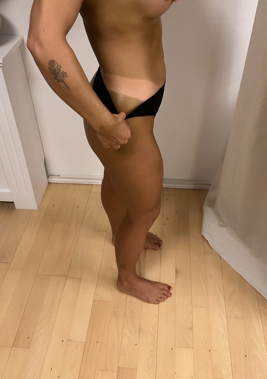 Mød gerne op i mørkt løstsiddende tøj, gerne uden stramt undertøj – undgå helst bh. Stramt tøj kan fjerne noget af tanning væsken efter behandlingen. For bedste resultat, bør du også møde op nyvasket, skrubbet og uden creme / parfume / makeup. Møder du op uforberedt, vil du stadigvæk få en fin kulør, men resultatet er bare flottere med den rigtige forberedelse. Behandling foregår ved at jeg sprayer dig med et fint lag over hele kroppen. Jeg tilbyder hårhætte, sticky feets til dine fodsåler og engangs trusser. Du vælger selv om du vil have undertøj på under behandlingen, vær dog forberedt på, at er undertøjet lyst, kan farven smitte af. Du vil se solbrun ud med det samme og kuløren tiltager i timerne efter behandlingen når væsken begynder sin virkning.